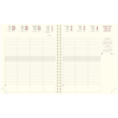 Couverture en plastique. Spirale intérieure, qui facilite la mise à plat. Impression en bordeaux et gris, sur papier ivoire, tranche naturelle, coins détachables, pour pouvoir accéder rapidement à la semaine en cours, emplacements pour les rappels.