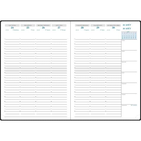 Un bel agenda façon cuir lisse aux finitions soignées. La semaine complète sur 2 pages à la verticale, d’un seul coup d’oeil, large amplitude horaire du lundi au dimanche (7h à 22h). Couverture amovible en simili cuir lisse aux finitions haut de gamme (piqûre sellier). Reliure brochée cousue pour une plus grande solidité.