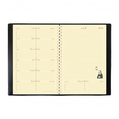 Agenda hebdomadaire avec une présentation de la semaine sur la page de gauche et une page de notes sur la droite pour un usage 2-en-1 agenda/carnet (Version Français).