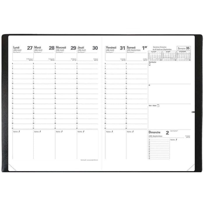 Agenda hebdomadaire avec présentation de la semaine sur 2 pages afin d’offrir une vue d’un seul coup d’œil